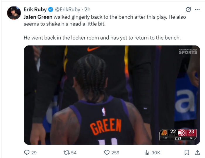 随后太阳官方宣布杰伦-格林因为腿筋伤势复发本场比赛不会回归,他本赛季合计才打四场比赛,而24-25赛季杰伦-格林常规赛打满82场,此前的四个赛季最少的一个赛季都能打67场,联盟又有一个铁人来到凤凰城后倒下了。