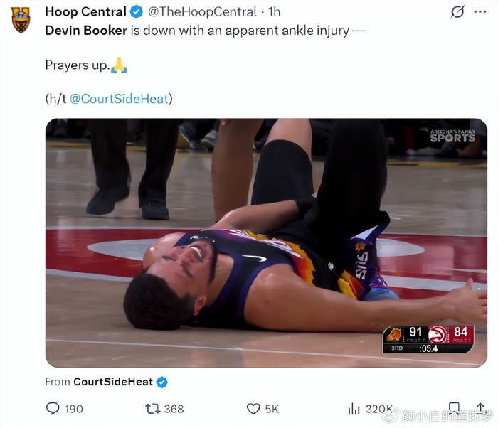 紧接着在第三节,德文-布克踩到了奥孔古的脚背,布克右脚踝有一个90度的扭曲,随后布克倒在地上捂着自己的脚踝呻吟,布克下场前太阳还领先7分。